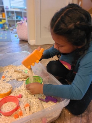 [This review was collected as part of a promotion.] At first glance, I didn't think these were going to be very special. We have shovels, spoons, funnels, etc. But after taking them out, feeling them, and watching the kids play with them, I have to say I really love them! They are thick, sturdy plastic that is going to withstand long term use/use by multiple children. The orange scoop encourages a different grip and gets a BIG scoop, which is super motivating. The sifter worked great in our oat sensory bin, letting just enough out for them to "sprinkle" their pies. The funnel I think is my absolute favorite. The flat edge allows children to easily scoop with the funnel portion and then allow the contents to fall out of the smaller side into the container. Never thought to use a funnel this way, and honestly didn't think to with this one but the kids did it immediately and loved it! Genius. I'd honestly buy a pack of all funnels if they made it. All the photos are a little blurry because they were constantly moving and working with these - another plus!