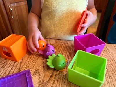 [This review was collected as part of a promotion.] My 2 year old really enjoys these birds! She loves sorting the birds in their houses and stacking them. While she's playing we talk about their colors and emotions, as well as count them.