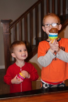 My three year old son loves the toy but he gets quite frustrated by the short length of the cone. Would suggest making the cones at least an inch longer. It is very frustrating and hard for him to hold the short cone stem and balance the ice cream scoops. The scoops don't fasten on very securely so between the ease with which they topple over and the short cone length, it is challenging. He loves ice cream and so loves the scoops and we have made up some fun games/imaginary play.
