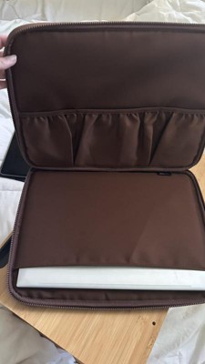 This is a really cute and functional laptop case! I have to admit that I initially grabbed this because it was aesthetically pleasing. I love the look of the leather-like material, it's a great caramel brown color. It's soft and supple and felt great in my hands. It protects my equipment without being bulky or hard to handle. The zipper is solid and feels like it will hold up to extensive use, which is great because I can't count how many times I put my laptop to bed only to remember the one thing I forgot to do smh. I love the interior pockets, the cord organizer is great and kept my charger and phone charger secure but easily accessible. This is a great pickup for anyone looking to keep their equipment secure and look good while doing it.