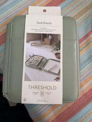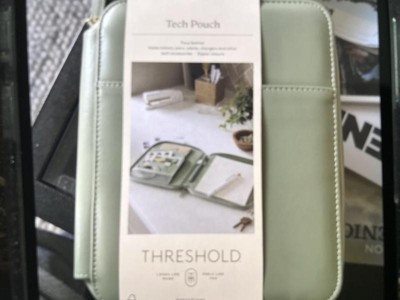 I recently received this lovely faux leather Tech Pouch, that carries all the things needed for on the go people! Note pad, pen,cord, chargers, and even holds your tablet.compact, made by Threshold, it zips close, making the contents secure!
