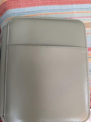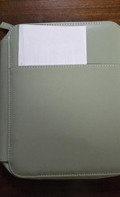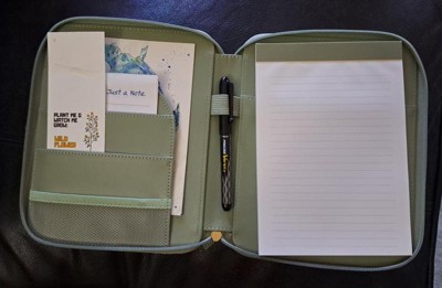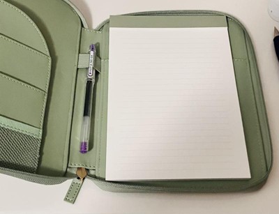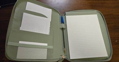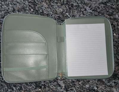 Nice leather zip case—it’s both soft and sturdy. The notebook inside has college-ruled pages on both sides and a decent number of pages, so it’s great for jotting things down. The side pockets looked a little short at first, but they actually hold my phone perfectly and could easily fit tech cords or other small items. I love how easy it is to carry to meetings, especially since I usually have my hands full. The built-in pen holder is a nice touch too. Overall, it’s super convenient and well-designed!