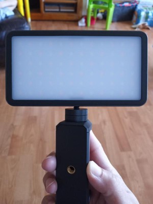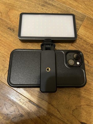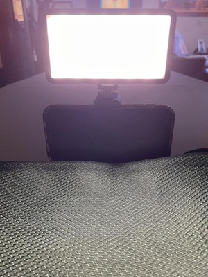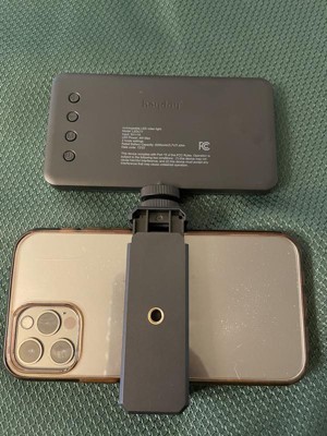 Small and compact this rechargeable LED video light has 3 light modes and adjustable brightness. Battery life is 1.5 hours. Has a great mobile phone mount that is easy to use. Works better than a ring light and is small! Love it