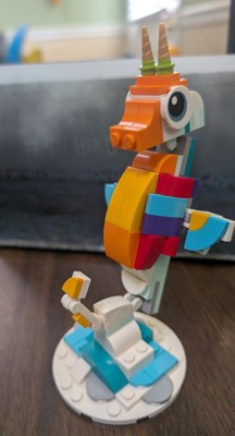 - The unicorn can be rebuilt into 2 other LEGO animals; a seahorse with movable tail, fins and head, or a peacock toy with movable tail and eyes