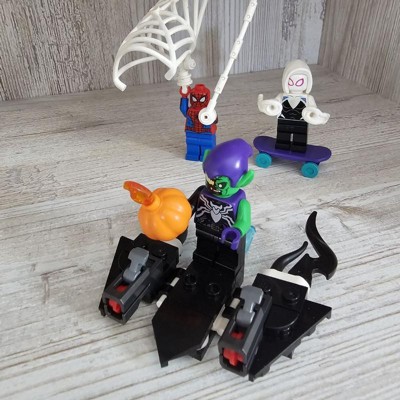 - LEGO Super Hero battles on wheels – Spider-Man’s car has 2 front stud shooters, Green Goblin’s glider has 2 stud shooters, and Ghost-Spider wears 2 hand web shooters as she rides her skateboard