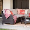 Add stylish extra seating to your outdoor space with the Jackson Sectional. Hand-woven in a beautiful dark brown all-weather wicker, the Jackson Sectional will be the focal point of any outdoor space. The armless seat section can be moved from right to left, depending on your needs. Cushions are a generous 22" wide and 4.5" thick, constructed with a soft top layer wrapped around a high density foam core. The sectional includes zippered cushion covers made with 100% solution dyed outdoor polyester. Jackson includes one left arm loveseat, one right arm loveseat, one armless chair, one corner chair, and one coffee table. Throw pillows and decorative accessories are not included. One year limited warranty. Assembly required.