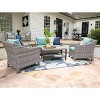 With a casual vibe, and comfortable sloping armrests, the Marietta Seating Set promises to be a destination spot in your outdoor space. The variegated warm gray tones in the all-weather wicker soften the otherwise modern silhouette. The frame is durable powdercoated steel where the frame is covered in wicker and rust-proof aluminum in areas exposed to the elements. Cushions are a generous 22" wide and 4.5" thick, constructed with a soft top layer wrapped around a high density foam core. The seating set includes zippered cushion covers made with 100% solution dyed outdoor polyester. One year limited warranty. Marietta includes: a loveseat (49.3" W x 34.5" D x 31.5" H); 2 arm chairs (27.5" W x 34.5" D x 31.5" H); and a coffee table (36" W x 21" D x 18.5" H). Throw pillows and decorative accessories are not included.