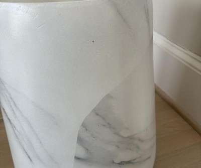 Nice attempt but it is like it was a reject or “second” with some finish missing and dripping stripes on either side as well as an an unnatural circular pattern. Strange. Lightweight hollowed pottery material with light finish to look like marble with gray. I expected brown veining. Too many flaws for the cost. Note the measurement on the top diameter is only about 11”