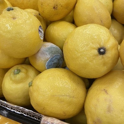 There is a completely molded lemon right on top. This has been frequent lately with the citrus at this location. The citrus is not fresh and someone should be checking on the fruit and maintaining it.