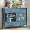 The Lifestorey Anneli Buffet offers convenient storage in an elegant design. Perfect for transitional spaces, it adds an eye-catching accent to your dining room and provides multiple compartments for storing all your dining accessories. Two glass-front cabinets provide access to an adjustable shelf, perfect for displaying dinnerware, glassware, bowls and more. Four drawers provide additional space for flatware, table linens, drink accessories and other miscellaneous items. Glass sides and bamboo-inspired accents on the corners provide additional detail that make this buffet truly unique. Choose from Marina Blue or Black finish, accented by metal hardware. Crafted with solid pinewood legs and MDF.