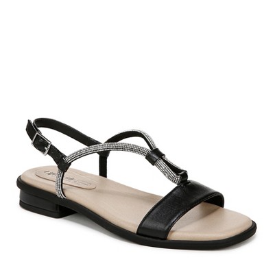 Add a little sparkle in these strappy women’s flat sandals with the perfect rhinestone accents, perfect for dressing up or down. Women’s slingback sandals designed with faux leather, an open square toe, slingback strap with adjustable buckle, and rhinestone detailing. Linings crafted from partially recycled materials.
