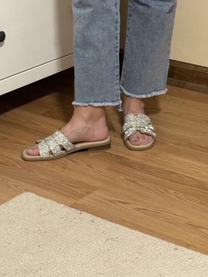 Perfect for elegant occasions or when you feel like adding extra sparkle, these comfortable slide sandals are a standout. Faux leather with an open square toe, slip-on fit, and sparkling rhinestone straps.