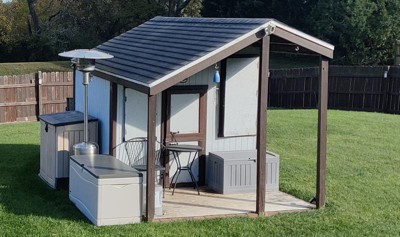 [This review was collected as part of a promotion.] Great looking, easy and rapid assembly. We now can store our 8' x 8' pop-up canopy for the winter out of the weather. Using it to block low hanging roof on grandkids playhouse. Adults don't notice its only 5' until they run into it with their forehead. Tan with brown top matches the other storage bin used for chairs for our fire pit. We also own a tall vertical Lifetime brand tool storage bin and two piece benches that transforms into a picnic table.