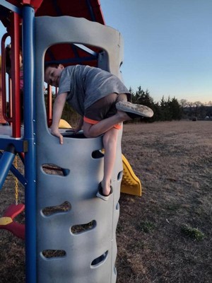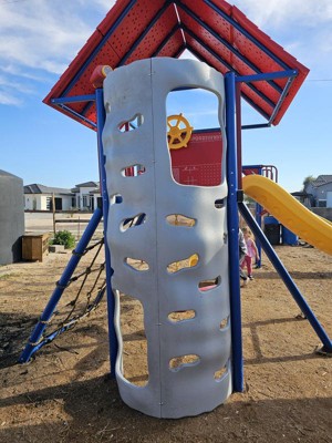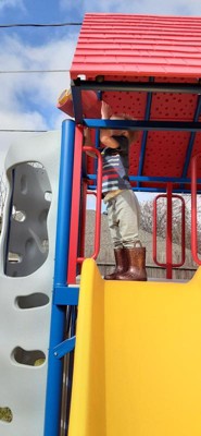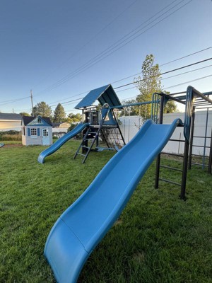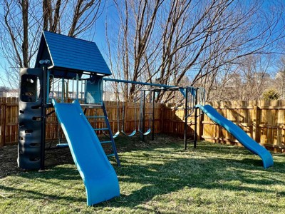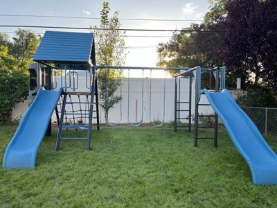 Oh my heck, we are so excited! We put our lifetime playground together and love the way it looks, the colors are awesome. Putting it together became a family event, directions were pretty straight forward, hardest part was finding where we wanted to put it in the yard and also the wasp sting we may have encountered (wasps not included!). So far the kiddos like what they call the “hideout” underneath the slide but have been enjoying the whole playground. We are very excited to have family over to share some fun with all the nieces and nephews/cousins. Big stuff deluxe playset in Jay Blue