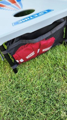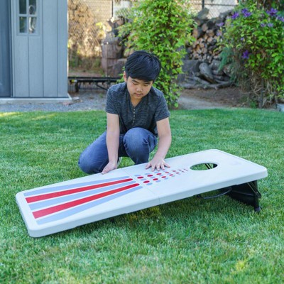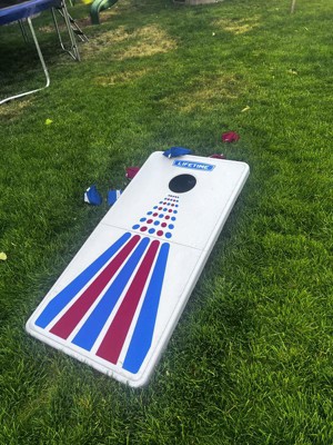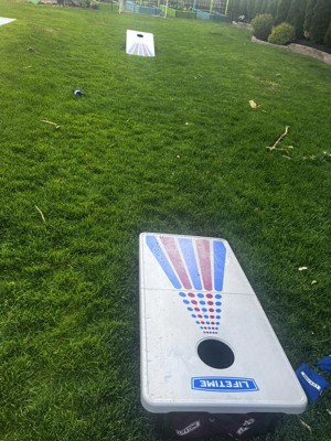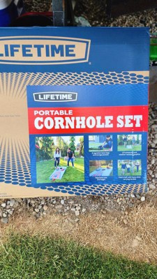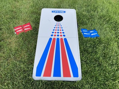 I was so excited to see that Lifetime came out with a Corn hole set! The quality is top notch and they make it super easy to store. Each board folds in half and has a handle to easily carry it. Under the boards is a net to store the bean bags in. They really thought of everything! The boards are lightweight but the beanbags do not bounce on it. This set will last a long time!