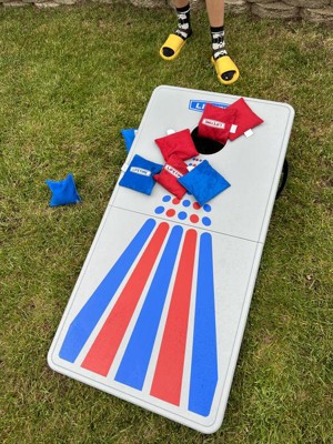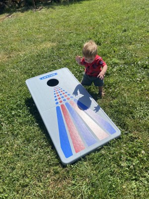 [This review was collected as part of a promotion.] We have been wanting to get a corn hole set for a while now, and I'm so glad we got this one. My favorite features are the storage bag for the beanbags so they don't get lost, and the fact that it folds up, with handles to carry it to different places. So convenient. We brought it over to play with family and everyone had a blast. The kids were walking on it and I didn't have to worry about it breaking because it's very durable. Would definitely recommend this corn hole set.