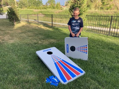 We think this is a great corn hole set! We were skeptical with the plastic material verses the traditional wood ones, but we were pleasantly surprised. The bean bags slide nicely. We love the storage bags on the back of the board for the bean bags. It’s nice that the boards fold in half but we do wish that there was a carrying/storage case to put the boards in. My husband appreciated the the measuring rope included so you can get the correct distance between the boards easily. Overall, we are happy with this set.