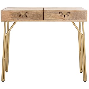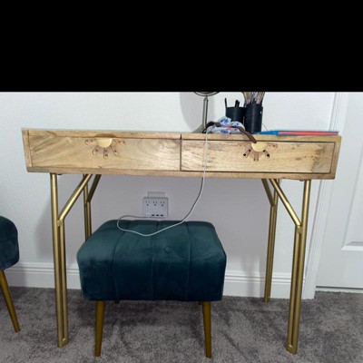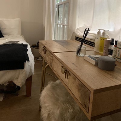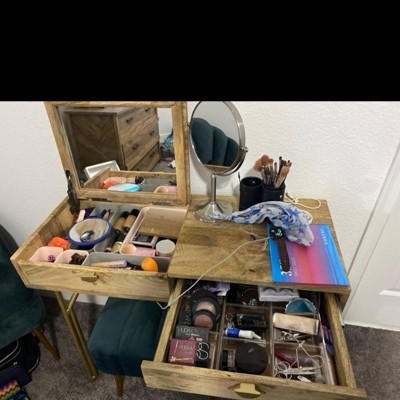 I have the Savafieh matching nightstands; so I decided to grab this on a sale to match my room. I used to have the Scandinavian white dressers and a popular vanity mirror, but as time goes by I felt I needed an upgrade for something unique. I downsized my makeup collection and this is perfect for all the essentials! Setup was easy, I had to screw the legs on and that was it. One of the screws broke off in the leg and I had to super glue it. Other than that it’s great. I used some target soft drawer organizers and the clear plastic organizers and it fits all the essentials perfectly! One star off for a screw breaking, and for the mirror not tilting back far enough to actually be useful. I still believe that this has more storage than the matching desk, so I will still use it.