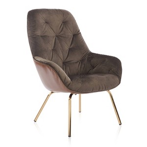 Take your living space or sitting area over the top with the inviting style of this brown fabric upholstered accent armchair. With a vintage character, the chair includes a curved back and plush upholstery to cradle you in comfort. It rests on metallic finish tube legs that add a gleaming personality while providing stability and support. Button tufting complements velvety soft fabric while a faux leather look backing lends a sleek finishing touch.