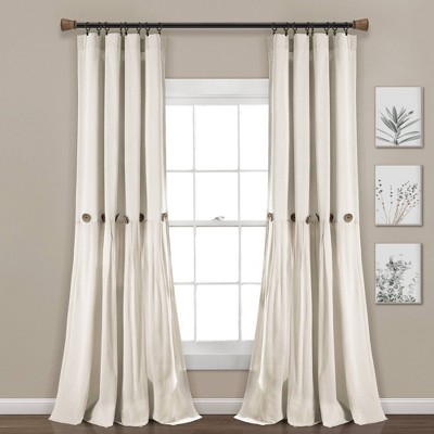 Add the elegance of linen to your home with these farmhouse chic Linen Button Window Curtain Panels. Color blocking is always in style and we love the details of pleats and buttons. Slight weave variations are authentic to this natural fiber blend and create a one-of-a-kind look. This stylish Linen Button Window Curtain Panel will add the perfect amount of flair to your bedroom, living room, dining room, dorm room or even nursery. This Linen Button Window Curtain Panel is available in a large selection of colors, making it easy to match any space. It's available in multiple lengths, including 84 inches, 95 inches and 108 inches. Some colors may not be available in all sizes. No matter which color or length you choose, each panel will measure 40 inches wide. The Linen Button Window Curtain Panel has a 3-inch rod pocket, so it hangs easily. You can slide the curtain rod through the rod pocket, or you can hang the panels from the rod with clip rings, as shown in the photos. They will let in plenty of natural light while providing ample privacy from neighbors and other outsiders. This style is sold by the single panel, so if you need to replace one panel or need an odd number of panels to cover your windows, you won't have to purchase more than you need. However, you will need to purchase two panels to get the look in the photos. Please note: The "white" portion shown in the photos is more of an off-white, natural fiber color. These are not pure white or bleach white. For your convenience, this Linen Button Window Curtain Panel is safe to machine wash and tumble dry. Please read the full care instructions on the label before washing. Part of the Linen Button Collection.
