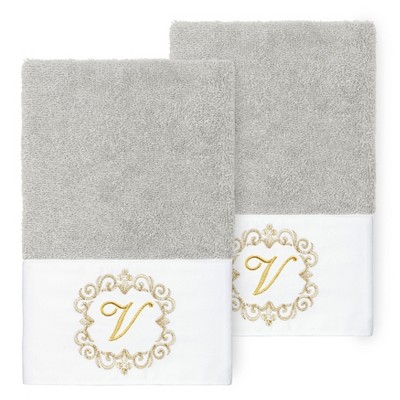 The Monica Embellished Towel Collection features an elegant metallic crest motif with your monogram embroidered on a crisp white border. These soft and luxurious towels are made of 100% premium Turkish Cotton and offer lasting absorbency and superior durability.