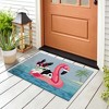 The Sit Stay Vacay accent mat features a tropical scene of a black and white dog on a flamingo float drifting off an island in the ocean.