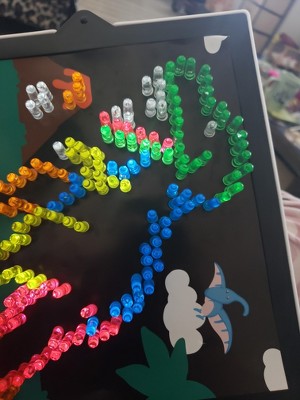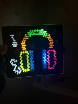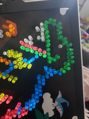 [This review was collected as part of a promotion.] This is such a fun creative toy. Both my 5 and 2 year old love it. My 2 year old likes to lay it down to stick the pegs in as the board tends to slide some. When playing this way it turns the light off sometimes. My 5 year old likes to make designs and loves the diffrent light choices. I put the pegs in a bowl to keep them from rolling away. We have only played a handful of times and the rubber facets for the back board are starting to not close all the way. Still better than the old school lite Brite we had as kids.