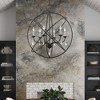 Collection: Aria, Material: Steel, Finish Color: Black/Brushed Nickel, Width: 28", Height: 31.13", Hanging Method: Chain, Chain Length: 36", Lamping Type: Incandescent, Number Of Bulbs: 6, Wattage: 360 Watts, Moisture Rating: Dry Rated, Desc: The delicate dangling crystals of the Aria collection adds an eclectic counterpoint to the luxurious orb. The six-arm light cluster nestled within orbiting rings features faceted clear teardrop crystals. This fixture will look fabulous in the dining room, bedroom or in the living room. With its easy installation and low upkeep requirements, this light will not disappoint. It is shown in a black finish with brushed nickel finish candles.,