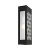 Collection: Berkeley, Material: Steel, Finish Color: Black, Width: 6", Height: 17", Depth: 3.95", Height From Outlet Box: 8", Backplate Width: 6", Backplate Length: 17", Lamping Type: Incandescent, Number Of Bulbs: 2, Wattage: 40 Watts, Moisture Rating: Dry Rated, Desc: The intricate details of the black finish on this outdoor wall sconce from the Malmo collection creates delightful shadow patterns on adjoining wall surfaces and walkways. This stainless steel fixture features glass panels finished clear on the outside and sandblasted on the inside.,