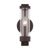 Collection: Castleton, Material: Steel, Finish Color: Bronze, Width: 4.75", Height: 12", Depth: 4", Height From Outlet Box: 6", Backplate Width: 4.75", Lamping Type: Incandescent, Number Of Bulbs: 1, Wattage: 60 Watts, Moisture Rating: Dry Rated, Desc: A glass cylinder shines with light as the bronze steel straps and backplate ground this sconce with modern style. A clean, sleek look that will add light while maintaining your minimalist look. Shade Included: Yes. ,