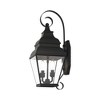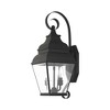 Collection: Exeter, Material: Brass, Finish Color: Black, Width: 8", Height: 21.5", Depth: 9.5", Height From Outlet Box: 10.75", Backplate Width: 5.25", Backplate Length: 9.25", Lamping Type: Incandescent, Number Of Bulbs: 2, Wattage: 60 Watts, Moisture Rating: Dry Rated, Desc: Finished in antique brass with clear beveled glass, this outdoor wall lantern offers plenty of stylish illumination for your home's exterior.,