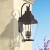 Collection: Exeter, Material: Brass, Finish Color: Bronze, Width: 14", Height: 36", Depth: 16", Height From Outlet Box: 17.25", Backplate Width: 5.5", Backplate Length: 15.5", Lamping Type: Incandescent, Number Of Bulbs: 4, Wattage: 60 Watts, Moisture Rating: Dry Rated, Desc: Finished in black with clear beveled glass, this outdoor hanging lantern offers plenty of stylish illumination for your home's exterior. Shade Included: Yes. ,