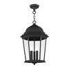 Collection: Hamilton, Material: Aluminum, Finish Color: Textured Black, Width: 12.5", Height: 20", Chain Length: 36", Lamping Type: Incandescent, Number Of Bulbs: 3, Wattage: 40 Watts, Moisture Rating: Dry Rated, Desc: The elegant silhouette of the Hamilton collection is a classic that is sure to please even the most discrimiting taste. This outdoor three-light pendant lantern features a simple six-sided frame in this textured black finish with clear beveled glass. Constructed of cast aluminum, this durable exterior fixture looks best in traditiol or transitiol outdoor settings. Canopy Included: Yes / Shade Included: Yes / Canopy Diameter: 4.25. ,