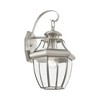 Collection: Monterey, Material: Brass, Finish Color: Brushed Nickel, Width: 8.5", Height: 13", Depth: 8.25", Height From Outlet Box: 6.75", Backplate Width: 4.75", Backplate Length: 5.5", Lamping Type: Incandescent, Number Of Bulbs: 1, Wattage: 100 Watts, Moisture Rating: Dry Rated, Desc: The Monterey outdoor lighting features clean, crisp lines complemented by the graceful curves of beveled glass. Crafted from sturdy solid brass this handsome colonial styling makes this fixture a perfect addition to your outdoor spaces. Shade Included: Yes. ,