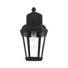 Collection: Morgan, Material: Aluminum, Finish Color: Textured Black, Width: 7", Height: 14", Depth: 7.5", Height From Outlet Box: 2.75", Backplate Width: 4.5", Backplate Length: 6", Lamping Type: Incandescent, Number Of Bulbs: 1, Wattage: 100 Watts, Moisture Rating: Dry Rated, Desc: With clear glass and a classic bronze finish, this outdoor wall lantern from the Morgan collection is an elegant way to illuminate traditional exteriors. Shade Included: Yes. ,