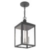 Collection: Nyack, Material: Steel, Finish Color: Scandinavian Gray, Width: 8.25", Height: 18.5", Chain Length: 36", Lamping Type: Incandescent, Number Of Bulbs: 3, Wattage: 60 Watts, Moisture Rating: Dry Rated, Desc: The dramatically simple shape and bold lines help define our Nyack wall lantern. Featured in a antique brass finish, this outdoor pendant lantern has panels of clear glass. Canopy Included: Yes / Shade Included: Yes / Canopy Diameter: 5 x 0.75. ,