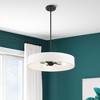 Collection: Venlo, Material: Steel, Finish Color: Black/Brushed Nickel, Width: 22", Height: 12.75", Hanging Method: Stem, Lamping Type: Incandescent, Number Of Bulbs: 4, Wattage: 160 Watts, Moisture Rating: Dry Rated, Desc: The Venlo collection is both modern and versatile. The satin brass finish with shiny white finish accents and hand-crafted off-white colored fabric hardback shade sets a pleasant mood. This sleek medium four-light drum pendant is a perfect fit for the living room, dining room, kitchen and bedroom.,