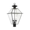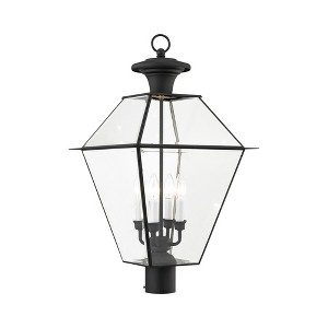 Collection: Westover, Material: Brass, Finish Color: Black, Width: 15", Height: 27.5", Length: 15", Lamping Type: Incandescent, Number Of Bulbs: 4, Wattage: 60 Watts, Moisture Rating: Dry Rated, Desc: Inspired by the historic look and romantic feel of gas-burning lamps, the Westover collection is reminiscent of antique gas lights still popular in Southern cities like Charleston and New Orleans. This solid brass piece features four lights behind large panes of clear beveled glass. Shade Included: Yes. ,