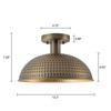This single flush mount ceiling light adds warmth and rustic charm to compact spaces. The hammered iron semi-dome shade, finished in antique bronze with a curled edge and gold foil interior, diffuses soft ambient light with elegance. Designed for an E26 socket and featuring a tight, flush ceiling fit with a compact base, it suits hallways, bedrooms, or entry areas. Comes with ETL label for reliable safety assurance.