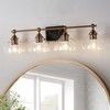 - Design: A twisted brass rod supports four bell-shaped clear shades on matte black mounts, lending artisanal character and classic glam to spacious bathrooms.