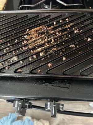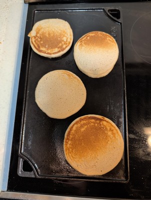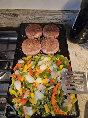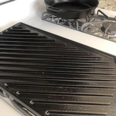 We have been struggling with stainless cookware creating mushy vegetables, and creating hard to clean messes; while actively avoiding nonstick cookware. Additionally, we wanted a flexible cooking tool - we don't have any 1-job cookware or gadgets in our kitchen. We looked at a few cast iron options, and landed on this griddle as a multi purpose cookware that can serve a few cooking roles while taking up a small amount of space. When we brought it home from Target (using a $10 off $20+ purchase coupon) we washed it, dried it, gave it a thin coat of vegetable oil, then warmed it up in the oven. In our first week having it, we have cooked on it on top of our gas range, on low after warming up: -Homemade Pupusas, cooking the cornmeal patties on the griddle getting them the perfect golden brown -Eggplant, peppers and onions followed by plant based chorizo. The flat surface made this cooking easy, creating crispy well seared veggies. The sides of the griddle are just high enough to keep the veggies under control, but not as tall as the sides of a skillet. -Beyond Sausage and Plant based egg. The sausage seared nicely, the plant based egg cooked well, but left a crust of egg residue that required scrubbing. The sides of the griddle worked for a thin layer of egg, but I will make smaller egg batches until we can get a skillet with taller sides. This is our toughest cleanup so far -2 Meals of quesadillas. The tortillas were crispy, and the griddle held up to our messy cooking style. We slop salsa and black beans onto the quesadillas and everywhere, with the griddle not breaking down in tears when some tomatoes got onto it as the internet warned us cast iron might. -Burgers and Peppers and Onions for a creative take on Sausage and Peppers. Peppers came out crisp and not mushy. It was great. We have only used the flat side of the griddle so far, not the "grilling" side. Cleanup is as straightforward as when we first got it home. We wash it, dry it, give it a thin coat of vegetable oil, then warm it up on the gas range. All in all, we are very happy with this griddle. Pros: The size is perfect for exactly 1/3 of our gas range; and we just store it on the range top. We came in expecting the low sides, and we haven't made any huge messes yet. We keep it on the side of our range with 2 large burners and the temperatures are pretty even across the griddle Cons: Our griddle moves slightly if you are getting aggressive with a spatula. I can see how a skillet with a handle slides less if you're holding the handle. Not the end of the world, we just slide it back. We went into this griddle wanting one tool for many jobs, so we are ok with this.
