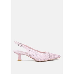 Stunning sling back heels with rhinestone details, a pointed toe, and a feminine kitten heel make this pair stand out in your shoe closet for all the right reasons! Type: Mules Upper Material: Mesh Light Cushion Insoles Outer Sole: Rubber Rhinestone Embellished Detail Pin Buckle Fastening Kitten Heel Closed Pointed Toe Light Cushion Insole SH4724