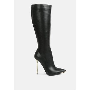 The knee-high boots are sleek and absolutely beautiful with the stiletto heels and metal lining pointed toe which also, compliments the metallic pointed high heel. Turn heads in style with these easy-to-wear winter boots which come with a side zipper opening. Outer material: Faux Leather Lining Material: Synthetic Outer sole: TPR Closed Pointed Toe Spool Heel High Quality and Durable Construction Slip Ons Casual Women's Sandals SH3299