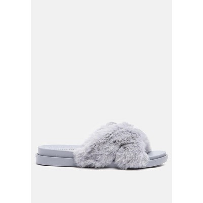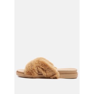 Fur Strap slip-on flat with a soft comfortable insole that secures feet well and with gripping outsole. Upper Material: Fur Lining Material: Synthetic Outer Sole: Synthetic Gripping and Durable Outsole Open Toe Slip-On Style SH2303