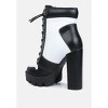 The high heel boots have a sneaker design element with lace ups and contrasting panelling which gives them an intriguing appeal in terms of visual aesthetic. The heeled boots are perfect for a street chic fit to amplify the cool vibe of street style. Outer material: PU Lining Material: Synthetic Outer sole: TPR Closed Almond Toe Lightly Cushioned Insole Ankle Platform Block Heel Lug Sole Lace-Up Details Autumn/Winter Boots SH3431