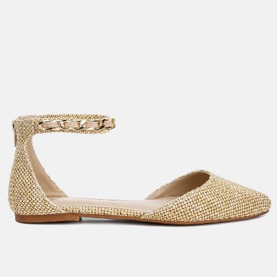 The canvas sandals are a summer chic wear with accentuating chain embellishment on the ankle strap. The flat sandals are easy to wear and would look stylish paired with a brunch outfit such as summer dresses or trousers and skirts! Type: Sandals Upper Material: Canvas Light Cushion Insoles Outer Sole: TPR Flat Heels Closed Pointed Toe Ankle Strap Pin Buckle Fastening Metallic Chain Embellishment SH4162