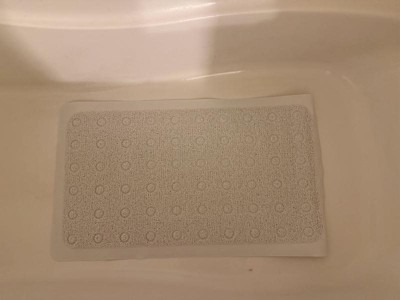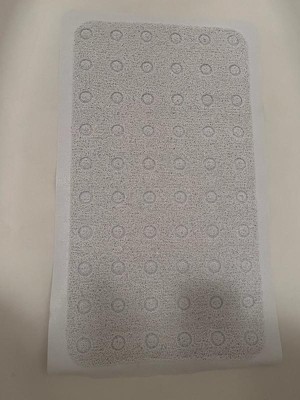 [This review was collected as part of a promotion.] Bright white, comfy, non-slip rubbery (100% pvc) mat with nice modern look. Makes my feet feel so good. Great to help prevent slips and falls. Has lots of rubber suction cups on under side, but honestly stays in place without them suctioning to surface. I tried wetting the suction cups to use them, but they did not stick to the base of my tub since my tub has a slip-resistant textured bottom already built in - the mat stayed solidly in place regardless. Love that the mat can be cleaned with mild bleach too! I plan to use a daily shower spray on it.
