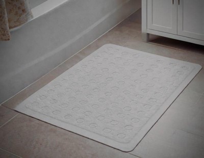 [This review was collected as part of a promotion.] Bright white, comfy, non-slip rubbery (100% pvc) mat with nice modern look. Makes my feet feel so good. Great to help prevent slips and falls. Has lots of rubber suction cups on under side, but honestly stays in place without them suctioning to surface. I tried wetting the suction cups to use them, but they did not stick to the base of my tub since my tub has a slip-resistant textured bottom already built in - the mat stayed solidly in place regardless. Love that the mat can be cleaned with mild bleach too! I plan to use a daily shower spray on it.
