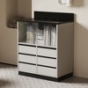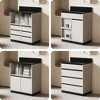 This is a storage cabinet in a modern and minimalist style. The main body of the cabinet is in a light color, paired with a dark - colored countertop, presenting a concise and neat visual effect. The diversified storage spaces facilitate the classified storage of small items and meet the storage needs. Decorative paintings, lamps, etc. can be placed on the top to play a role in space embellishment. Overall, it is suitable for modern home or office spaces, combining aesthetics and practicality, and creating a simple, fashionable, neat and orderly environmental atmosphere.