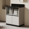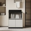 This is a storage cabinet in a modern and minimalist style. The main body of the cabinet is in a light color, paired with a dark - colored countertop, presenting a concise and neat visual effect. The diversified storage spaces facilitate the classified storage of small items and meet the storage needs. Decorative paintings, lamps, etc. can be placed on the top to play a role in space embellishment. Overall, it is suitable for modern home or office spaces, combining aesthetics and practicality, and creating a simple, fashionable, neat and orderly environmental atmosphere.